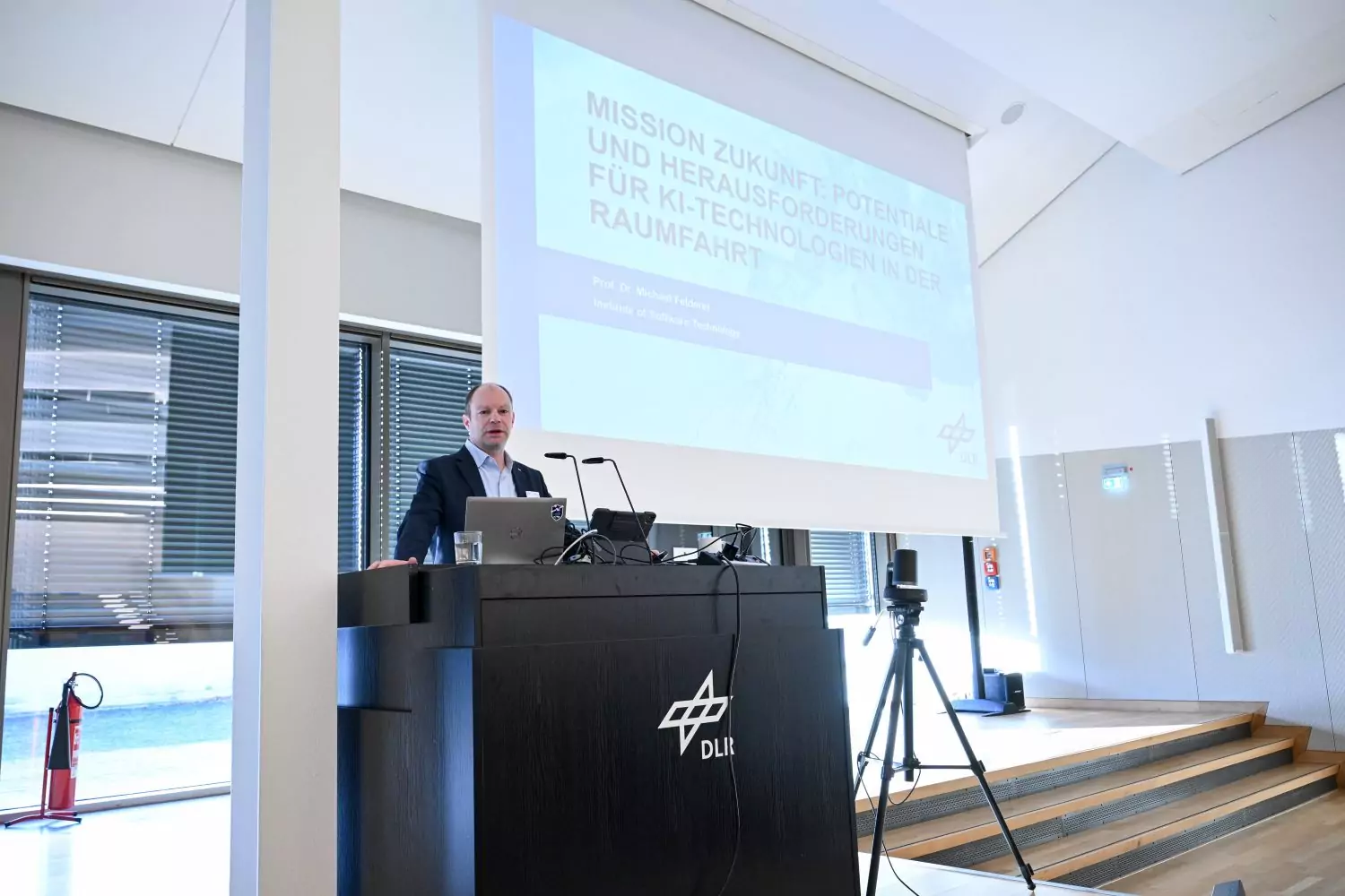 Den inhaltlichen Auftakt bildete eine Keynote von Herrn Prof. Felderer, dem Leiter des Instituts für Softwaretechnologie im DLR, zu den Potenzialen von Künstlicher Intelligenz in der Raumfahrt. In seiner Keynote zeigte er die Bandbreite möglicher Einsatzfelder – von der Erdbeobachtung über autonome Systeme bis hin zur Missionsplanung – auf und adressierte zugleich zentrale Herausforderungen wie Vertrauenswürdigkeit, Datenverfügbarkeit und technologische Souveränität.