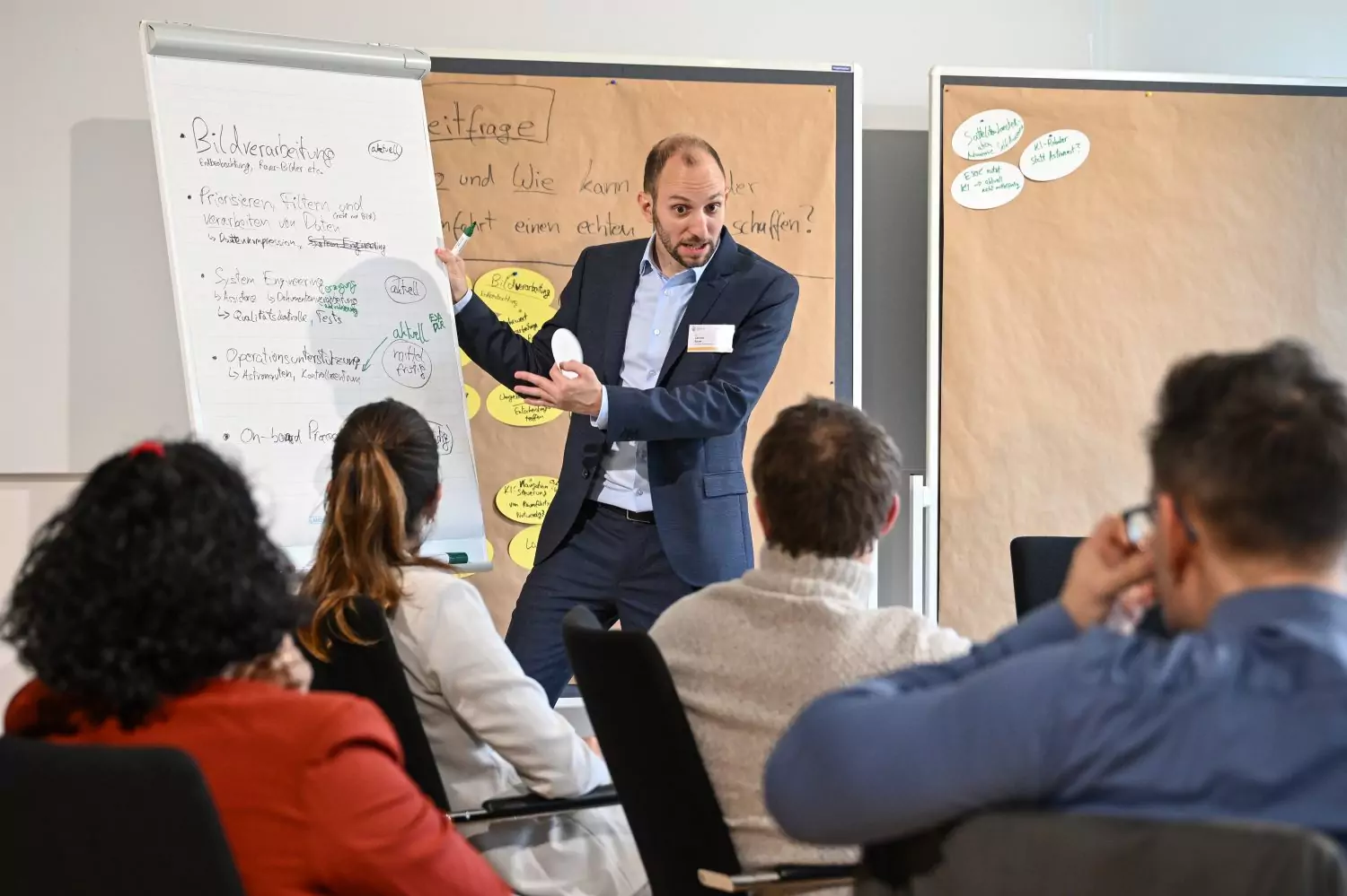 Die Diskussionen in der Themeninsel Vertrauen machten deutlich, dass Vertrauen in KI stark kontextabhängig ist. Entscheidend sind der jeweilige Nutzer, die Zielsetzung und der konkrete Anwendungsfall. Daraus ergibt sich, dass es nicht „die eine KI“ geben kann, sondern unterschiedliche Lösungen für unterschiedliche Anforderungen notwendig sind. Als zentrale Herausforderungen wurden unter anderem Fragen der europäischen KI-Entwicklung, technologische Abhängigkeiten sowie die Qualität und Verfügbarkeit von Daten identifiziert. Als Lösungsansätze wurden insbesondere Datenhubs, der Zugang zu großen Mengen zielgerichteter Daten sowie deren Qualifizierung hervorgehoben.
